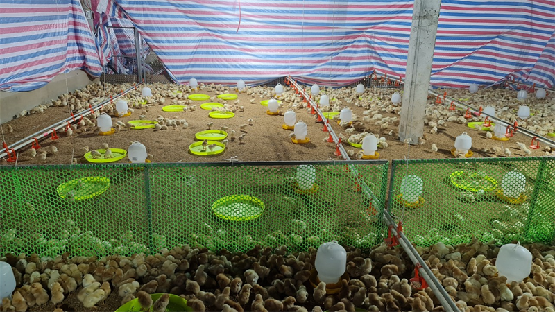 The chicken brooding area and the feed warehouse.