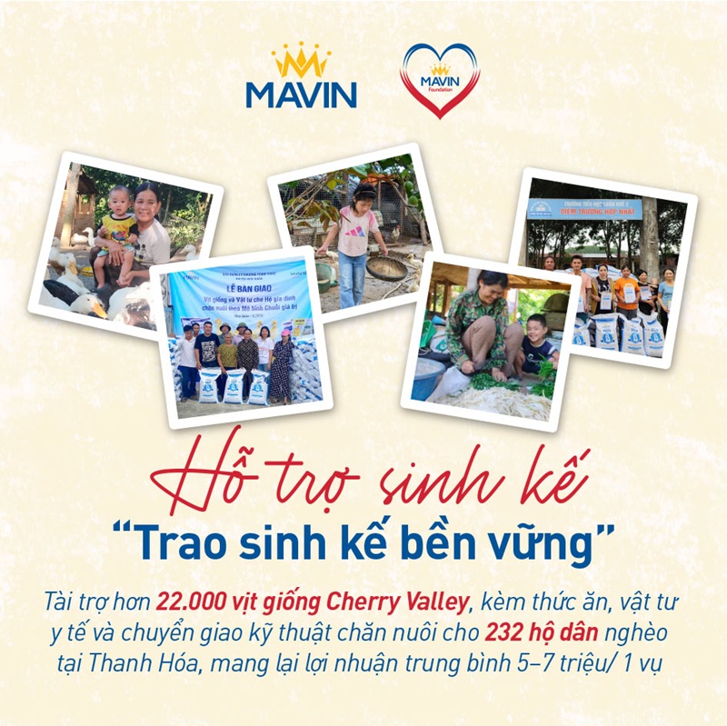 Continuing its 7-year cooperation with World Vision International, in 2025 the Fund and Mavin sponsored more than 22,000 ducklings, along with feed, veterinary supplies, and livestock training for 232 impoverished households in Thanh Hoa (in the districts of Nhu Xuan, Thuong Xuan, and Quan Hoa). This program not only generated the highest average profits ever (5–7 million VND per household), but also empowered families with technical know-how to independently restock in future seasons, gradually improving income and family economic development sustainably.